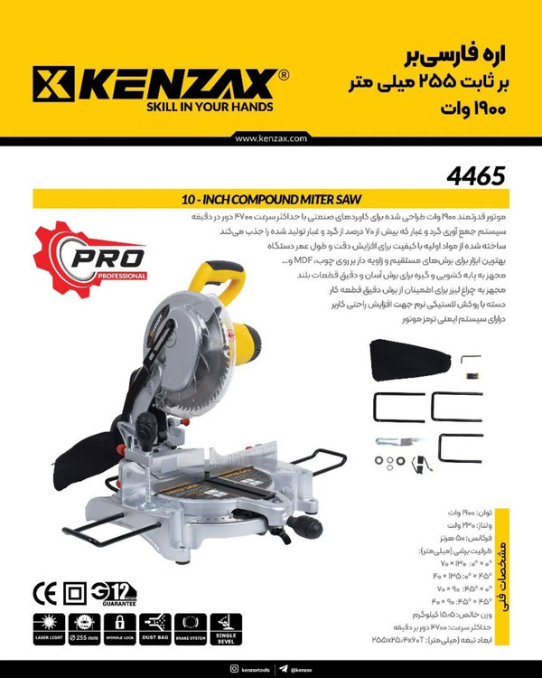 اره فارسی بر های جدید کنزاکس سری حرفه ای یا PRO دارای قدرت 1900 وات و بدنه تمام فلزی آلومینیومی تیپ ثابت و مناسب برش تمام چوب های سخت و نرم ایمنی عالی به لطف تکنولوژی ترمز مکانیکی در موتور تجهیز شده به نور لیزر راهنمای خط برش با دقت بالا امکان افزایش عرض کارگیر به کمک میله های کمکی ارائه با تیغ الماسه مرغوب 60 دندانه با قطر 255 میلی متر طراحی دسته تیپ D شکل با سوییچ ماشه ای بزرگ دارای پین قفل کن، ضامن خلاص کن گارد و قفل کن زاویه تضمین اصالت و سلامت کالا به همراه گارانتی 12 ماهه