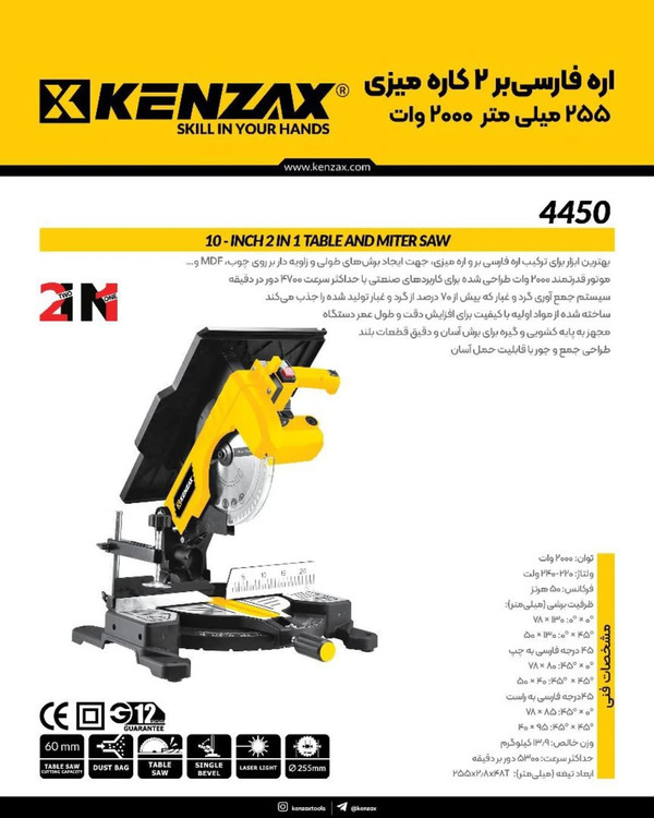 نسل جدید ابزارهای برند KENZAX با کیفیت فوق العاده اره میزی و فارسی بر 2 کاره با موتور قدرتمند 2000 وات رفع نیازهای برشکاری تمام نجاران، سازندگان کابینت، مبل و... برای انواع برش مستقیم و فارسی روی قطعات کوچک و بزرگ میز کار فوقانی پهن با ابعاد 448x290 و عمق برش 60 میلی متر گونیا و سینی مدرج به همراه لیزر راهنمای خط برش سیستم استارت با سوییچ شستی جداگانه و ایمن شده تیغه قطر 255 میلی متری 48 دندانه محافظت شده از دو طرف سینی و پایه و بدنه از جنس آلومینیوم مستحکم و سبک ارائه با 12 ماه گارانتی رسمی و خدمات پس از فروش طولانی
